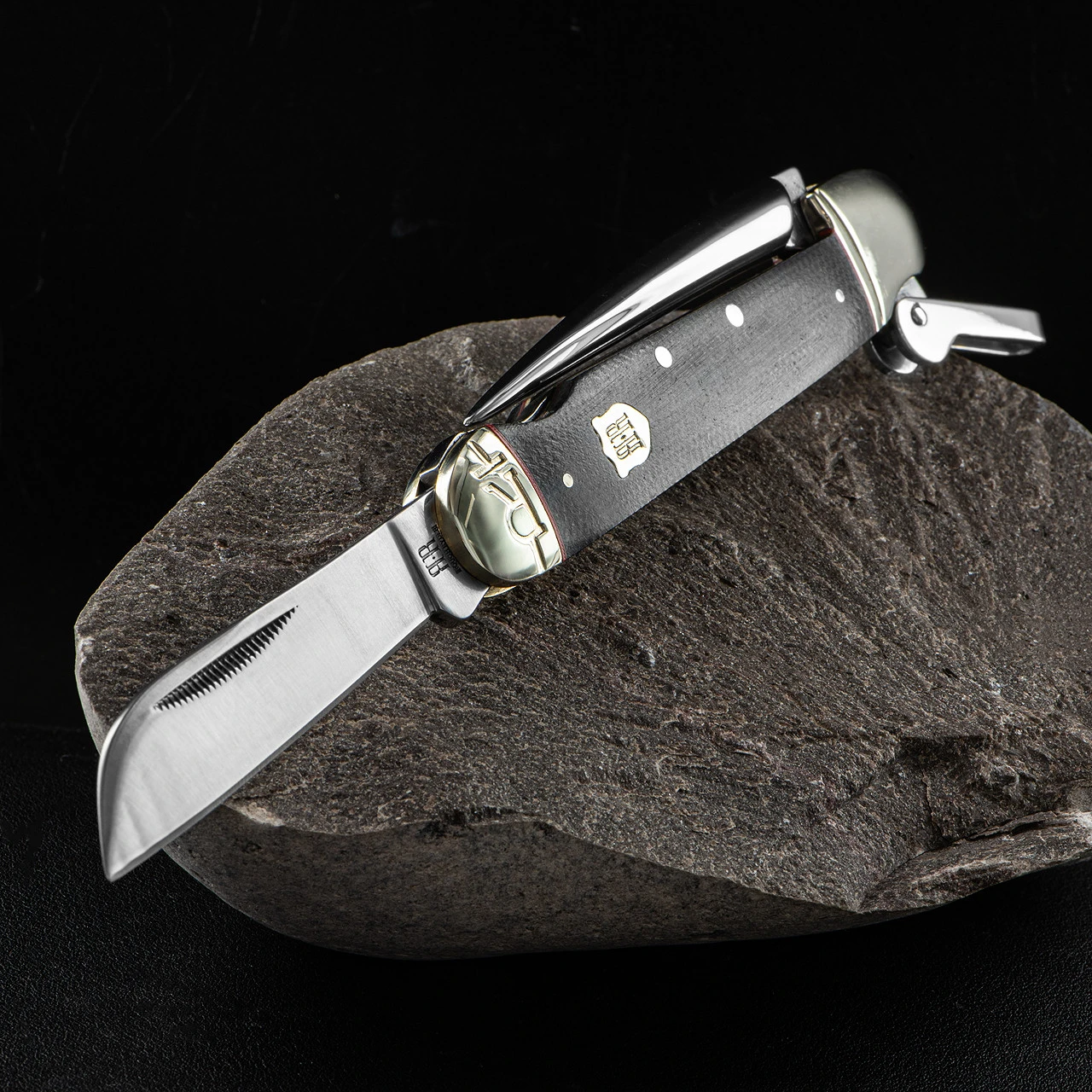 The Rough Rider Highland Marlin Spike is a powerfully built folding knife that you can depend on out the toughest environments. It features a 440 stainless steel Sheepsfoot blade and a 7.0cm marlin spike designed to get those troublesome knots open but has many other uses too. There is also a locking bail to attach to pockets and packs. The attractive handle is a combination of black Micarta with red spacers, ringed and embossed nickel silver bolsters, and a nickel silver Rough Ryder shield.
