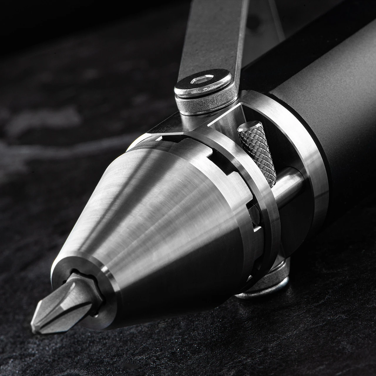 The 1949 fits standard sized bits and will accommodate eight in the storage area of the tool. The whole thing is made from Grade 5 Titanium which is incredibly strong and light in weight. The perfect combination for an EDC tool.