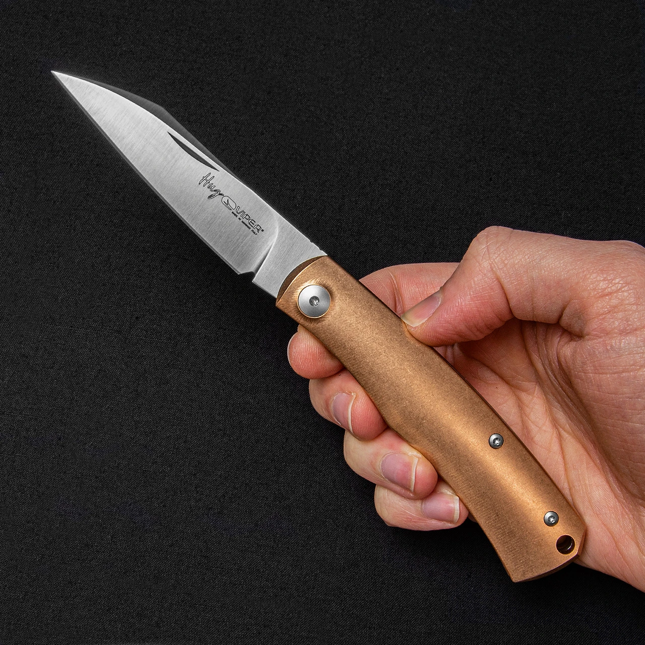 The Hug is a compact folding knife with a peaceful temperament, designed to go with its owner every day, always ready to offer extraordinary cutting qualities thanks to its ultra sharp Böhler M390 blade which is elegantly satin-finished. This is a very special folder with a heavyweight bronze handle.
